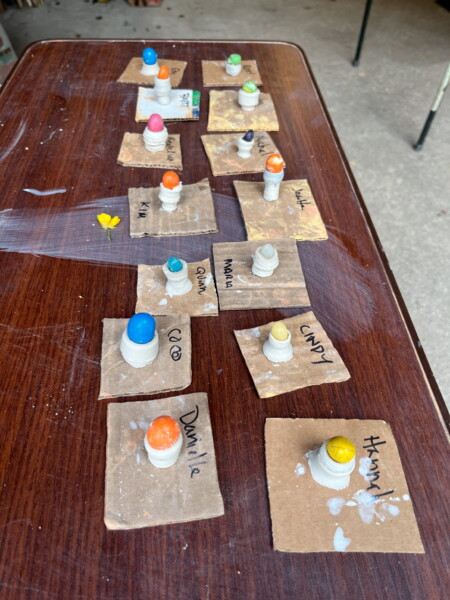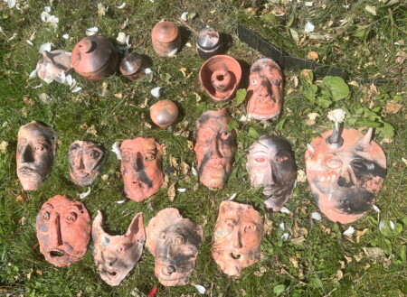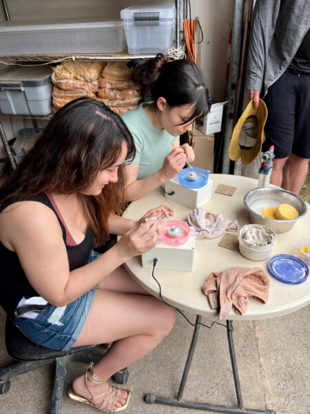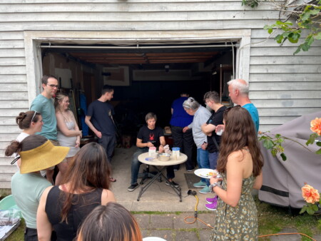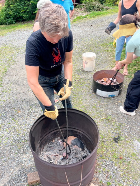 It wouldn’t be Seattle without a little Spring drizzle, but it didn’t dampen any enthusiasm for seeing freshly fired pottery from the kiln (final glaze firing). Nor anticipation for how pre-prepped pieces from the barrel firing would come out, which always carries a bit of mystery. No two barrel firings are the same!